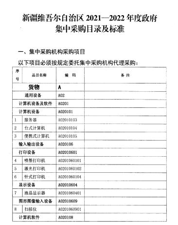 新疆维吾尔自治区2021-2022年度政府集中采购目录及标准