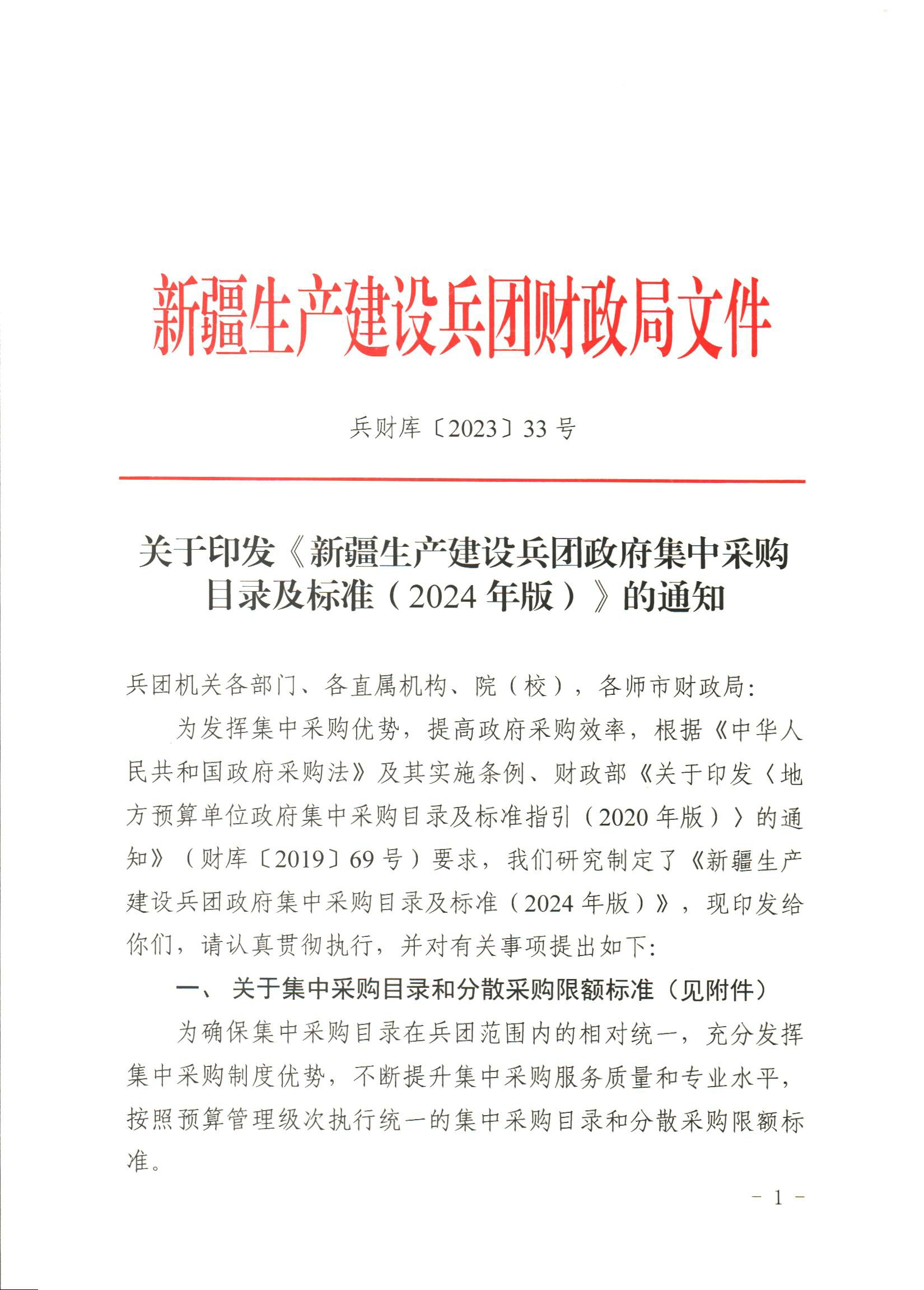 新疆生产建设兵团政府集中采购目录及标准(2024版)