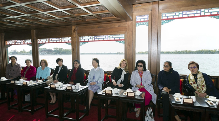 颐和园里,彭丽媛与出席2014年APEC领导人非正式会议的部分经济体领导人或代表的夫人一起乘画舫游览昆明湖。在船上,彭丽媛笑着对夫人们说:“百年修得同船渡,大家来自五湖四海,能够同乘一条船是难得的缘分。相信今天的活动后,我们之间的相互了解和友谊会进一步加深。”