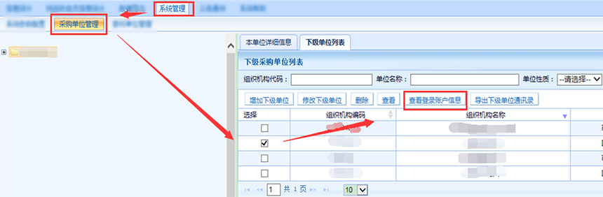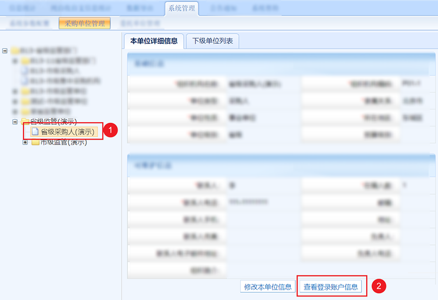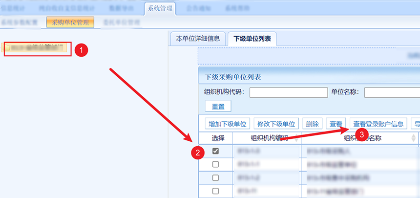 方法一,在左侧组织树找到下级单位并选中,然后点击查看登录账户信息。