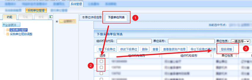 首先,在下级单位列表选择要迁移的下级单位,然后点击层级调整。